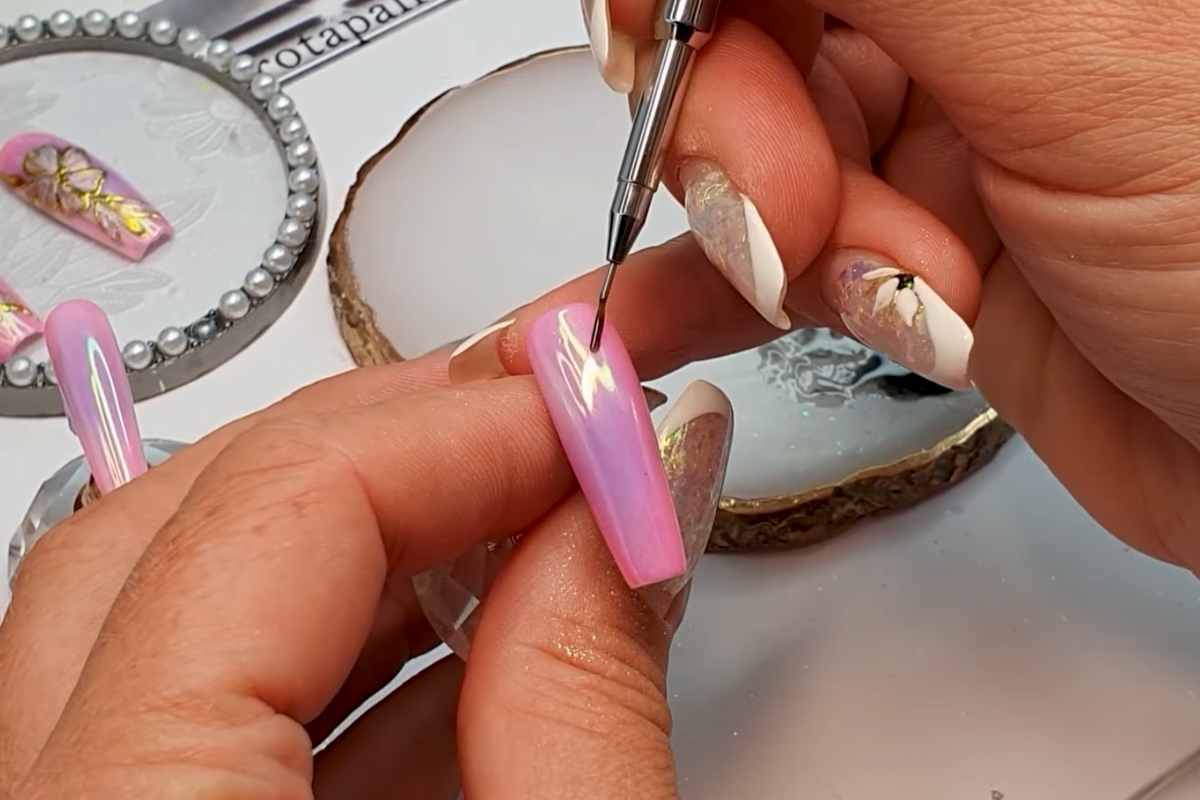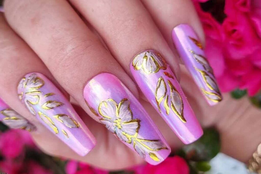 In the featured design, the soft pink and purple base softens the chrome effect, making it feminine and wearable while keeping that glam edge.