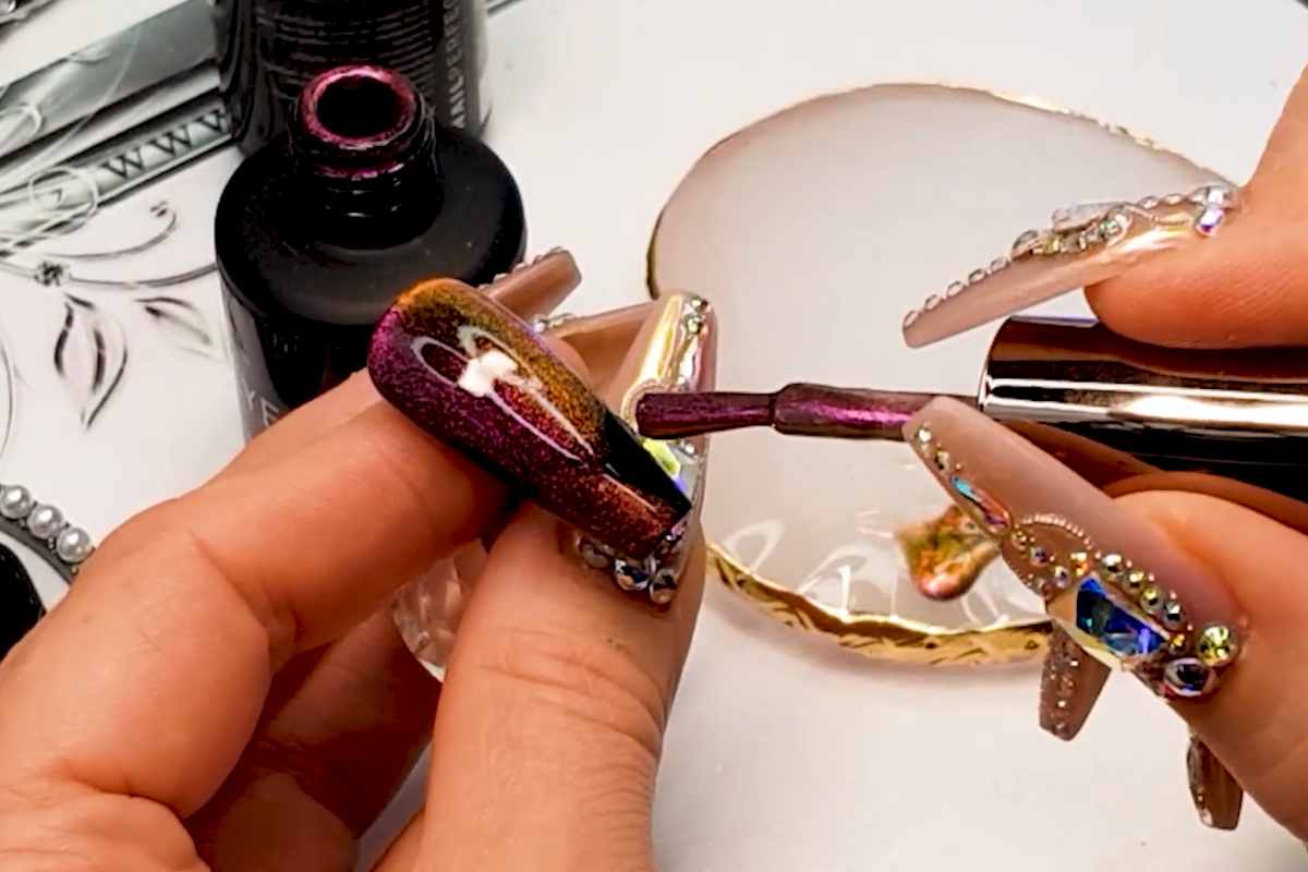 Magnetic gel polish is what truly elevates this nail trend. Unlike regular polish, magnetic gel contains tiny iron particles that respond to a magnet during application.